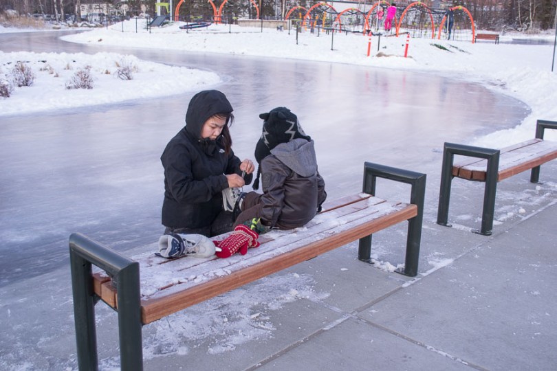 Chanshtnu Muldoon Park’s ice ribbon is ready for ice-skating. Lighted for night skating in Muldoon Town Square.