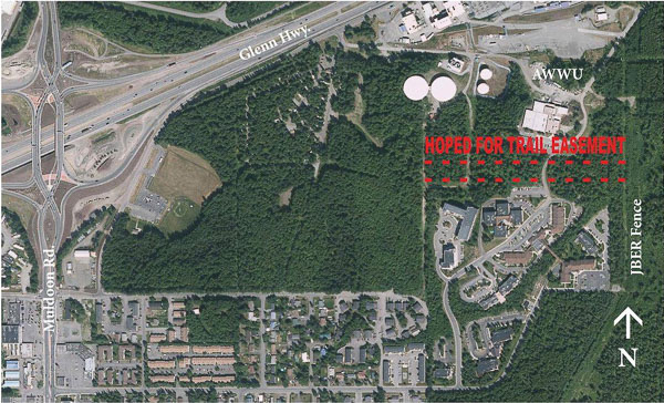 Attention, Centennial Park Users. Due to the pending sale of Municipal Light & Power (ML&P) to Chugach Electric, the land east of Centennial Park has to be re-platted. This has given the community a chance to secure a trail easement going east of Centennial Park to the JBER military fence.