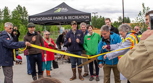 Mayor Ethan Berkowitz and Ainslee Phillips snip the ribbon at Spirit of Muldoon picnic to open Anchorage’s newest park at